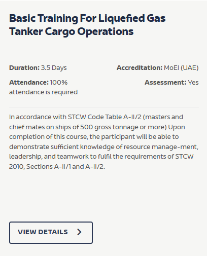 The course based on IMO Model Course 1.04, prepares officers and ratings serving on LNG and LPG carriers. Aligned with STCW Code Section A-V/1-2 (Manila Amendments 2010), the 3.5-day course covers tanker safety, cargo systems, fire-fighting, pollution prevention, occupational health, and emergency response. Assessment is both theoretical and practical, with 100% attendance required.