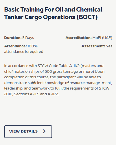 Basic Training for Oil and Chemical Tanker Cargo Operations (BOCT), aligned with IMO Model Course 1.01 and STCW Regulation V/1-1, equips seafarers with essential Knowledge, Understanding and Proficiency for safe tanker operations. The 5-day course builds competence in cargo handling, hazard prevention, firefighting, emergency response, occupational safety, and pollution prevention.