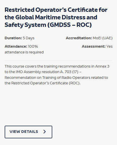 The Restricted Operator’s Certificate (GMDSS–ROC) course, based on IMO Model Course 1.26 and aligned with IMO Resolution A.703(17) and Radio Regulations 2012, equips trainees to operate GMDSS equipment and manage distress, urgency, safety and routine communications. The 5-day programme includes theory and practical assessment and is accredited by MoEI (UAE).